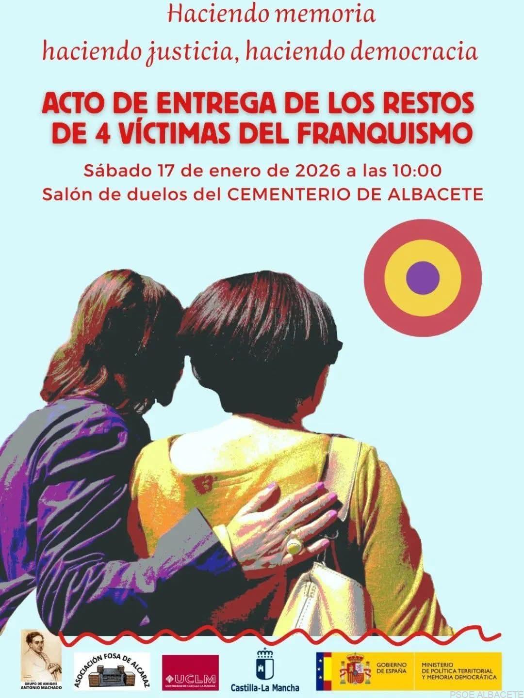 El próximo sábado, 17 de enero, a las 10.00 horas, en el Salón de Duelos del Cementerio de Albacete, tendrá lugar el acto de entrega a las familias de los restos de Francisco Fenoll Lozano, Eleazar Navarro Rodríguez, Antonio Andrés García y Antonio Poveda Ruiz, ejecutados el 14 de enero de 1940 por el régimen franquista.